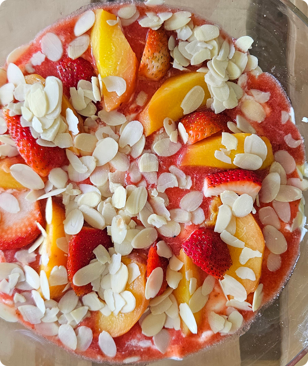Step 1 Line a large glass trifle bowl with the cake/s; drizzle over the sherry, making sure the cake soaks it up, then allow it to soak for 30 minutes before adding the fresh or frozen strawberries and peach slices, leaving some for decoration.
